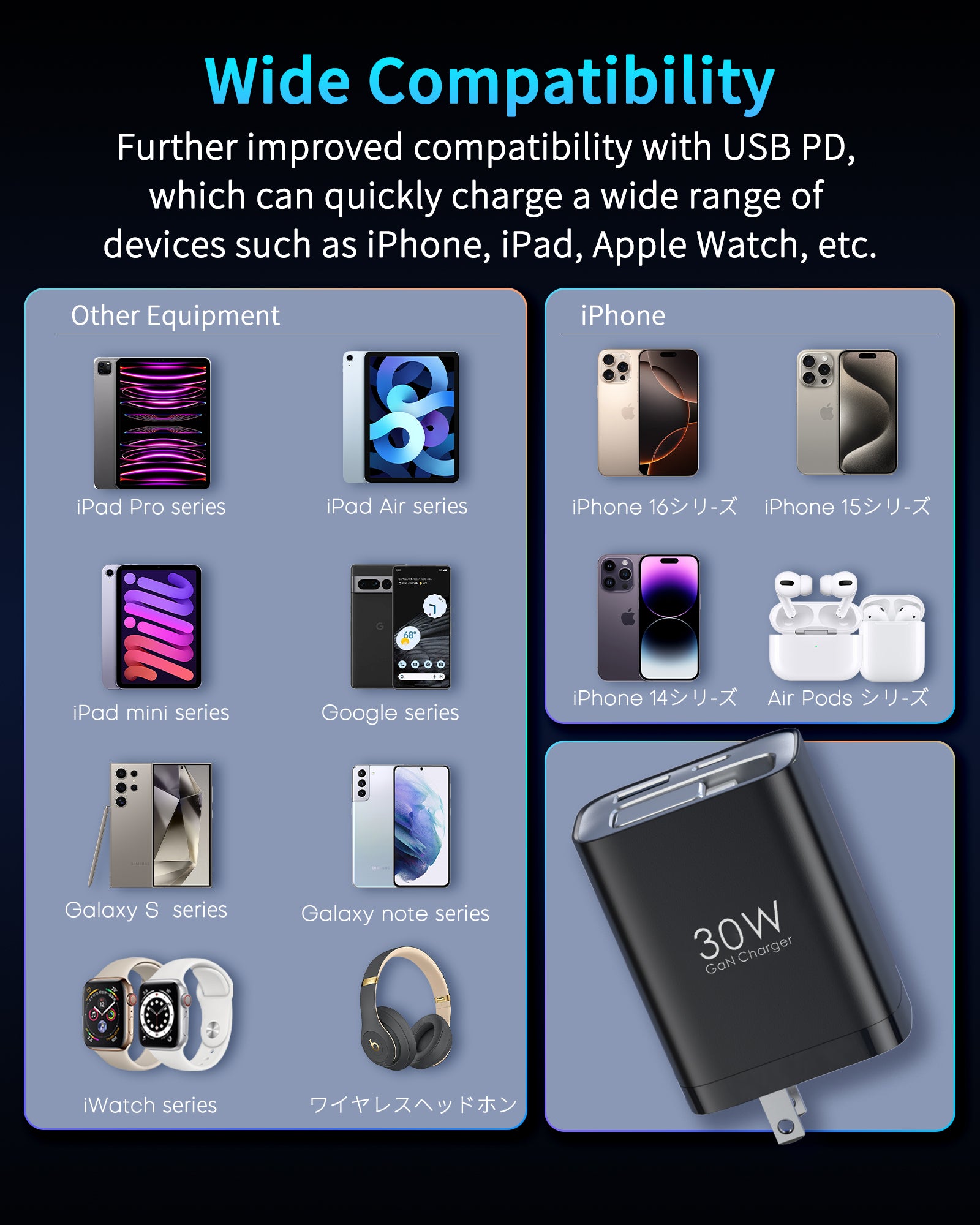 - GaN Technology for Efficient Charging Equipped with advanced GaN technology, this charger delivers stable and efficient 30W fast charging in a compact size.