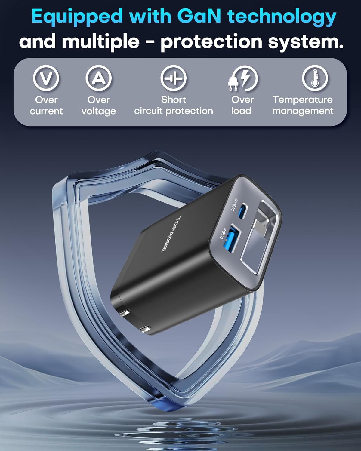 - 【3-Port USB C Charger】: Efficient charging awaits! This fast GaN charger has two USB-C ports and one USB-A port, which can supply powers to your equipment at the same time, minimizing downtime. Its compact foldable design frees up valuable desktop space without occupying three wall outlets. It is the perfect choice for travelers and professionals, which can reduce the weight of backpacks and is the ultimate substitute for the original USB charger. Upgrade now for seamless charging on the go!