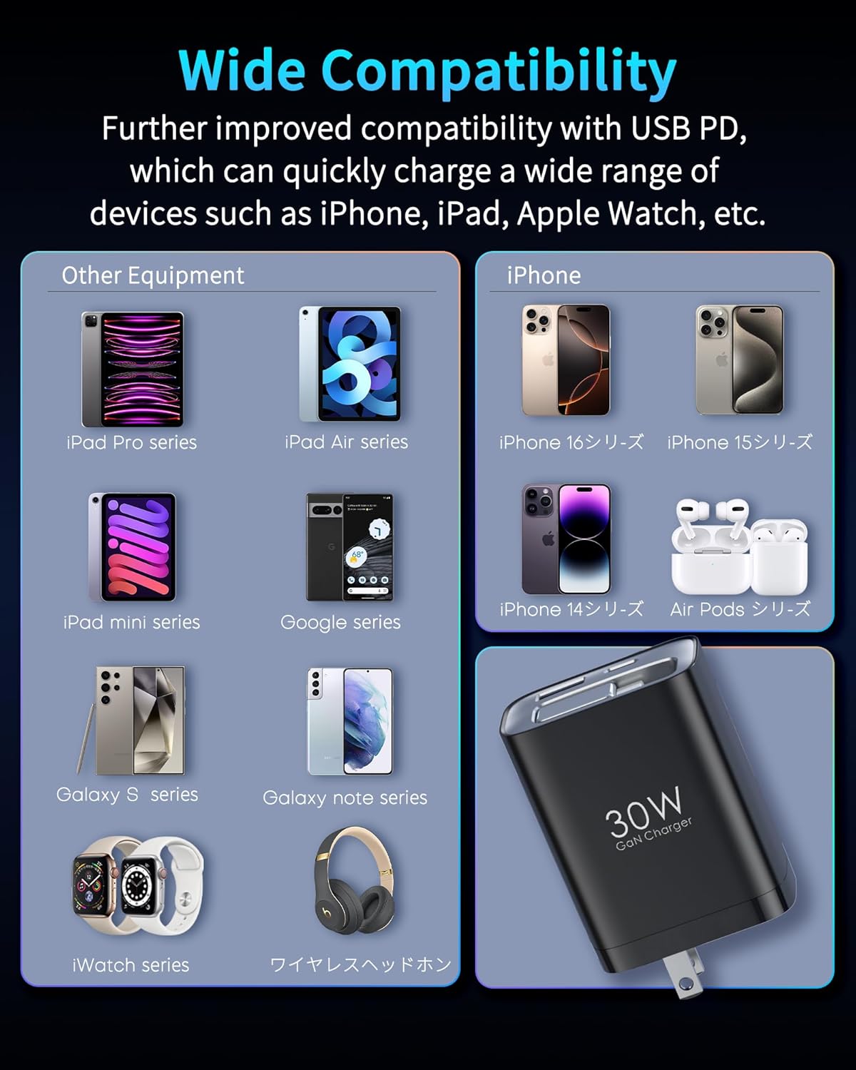 Retractable Wall Charger, 30w PD USB C Fast Charger Block with Foldable Plug Portable Adapter for MacBook Pro/Air, ipad Pro/Air, iPhone 15/16 Pro/Pro Max, for Galaxy S24/S23