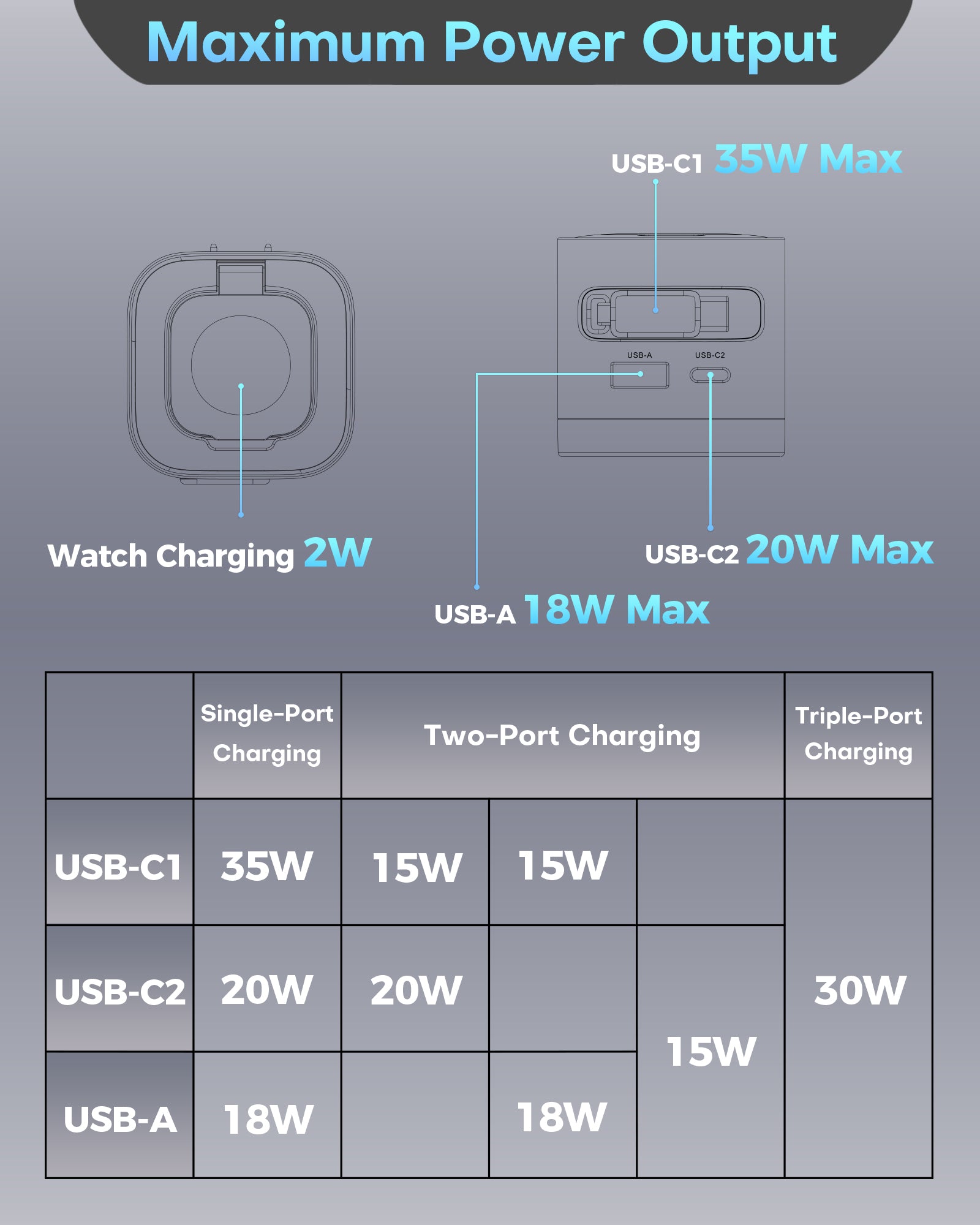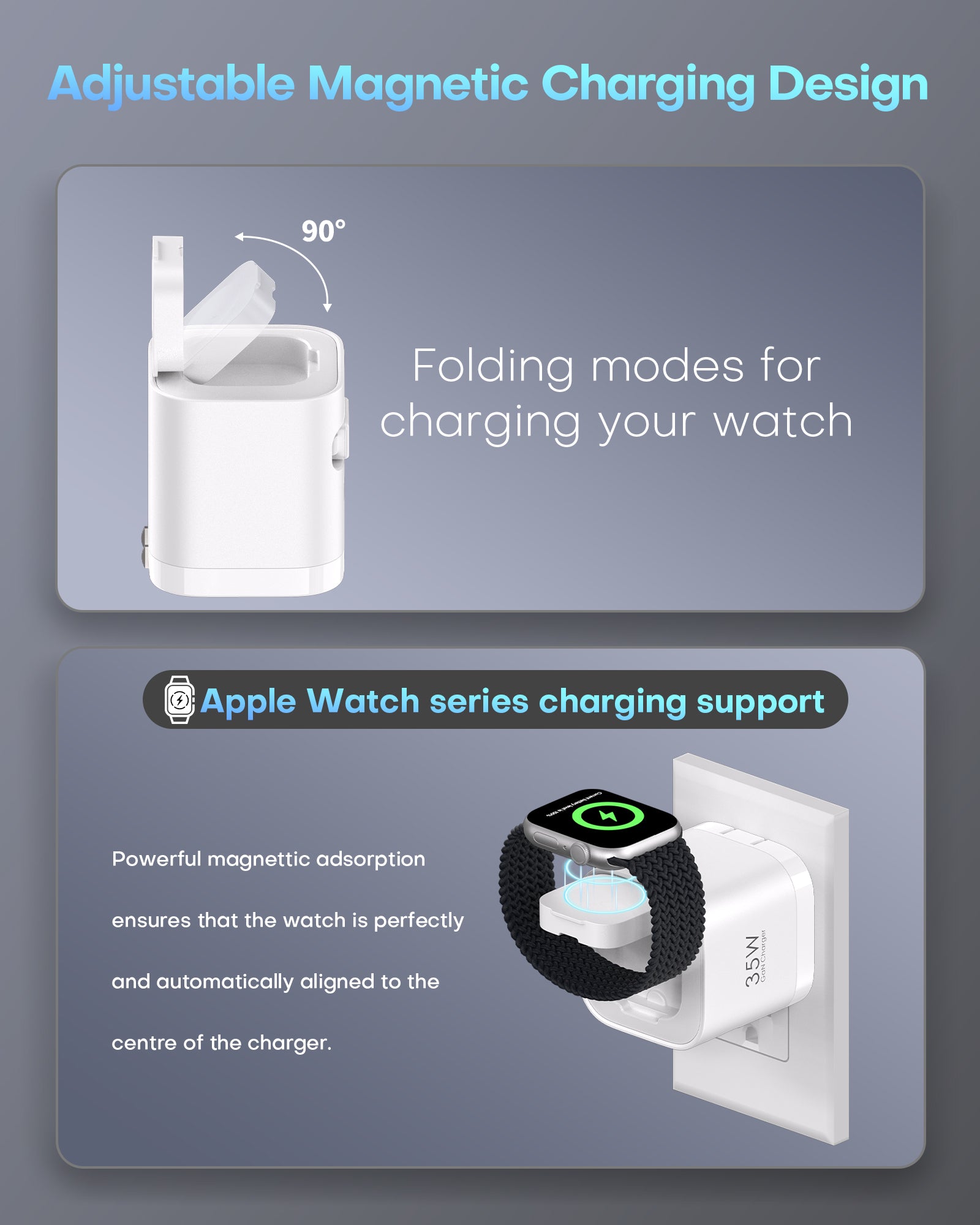 【4-in-1 Multi-Device Charging】This USB charger plug can charge your phone, headphones, applewatch and i Pad at the same time, replacing four separate fast chargers and one cable, simplifying the charging setup and saving space, perfect for travel or office use.