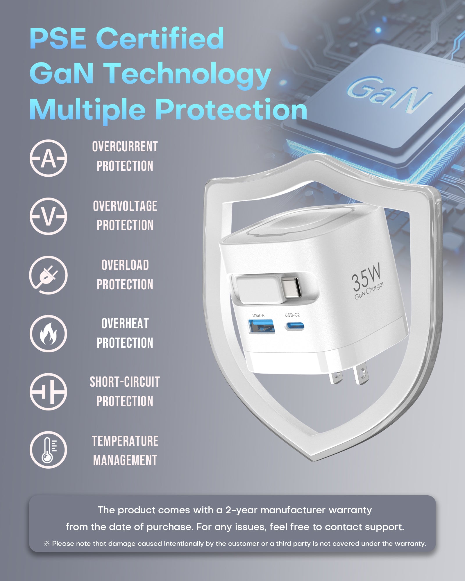 【GaN technology always protects you】Our UK plug uses GaN (Gallium Nitride) technology to reduce the heat generated by the device during charging, and provides 7 layers of protection against overvoltage, overcurrent, overheating, etc., ensuring your device charges sa-fely and reliably, and extending the life of the device.