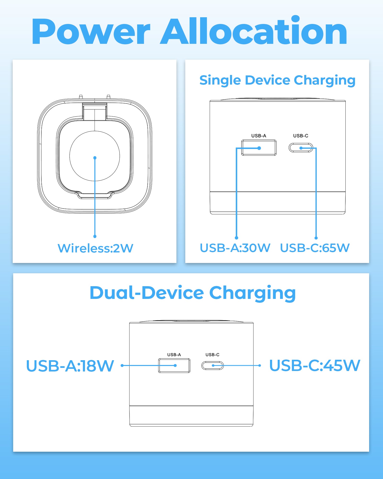 - 3-in-1 Charging with Wireless Support Includes built-in magnetic wireless charging pad for smartwatches and dual wired outputs (USB-C + USB-A).