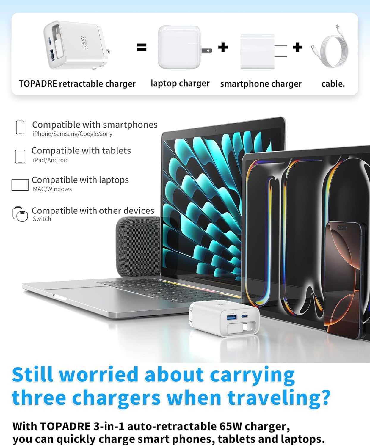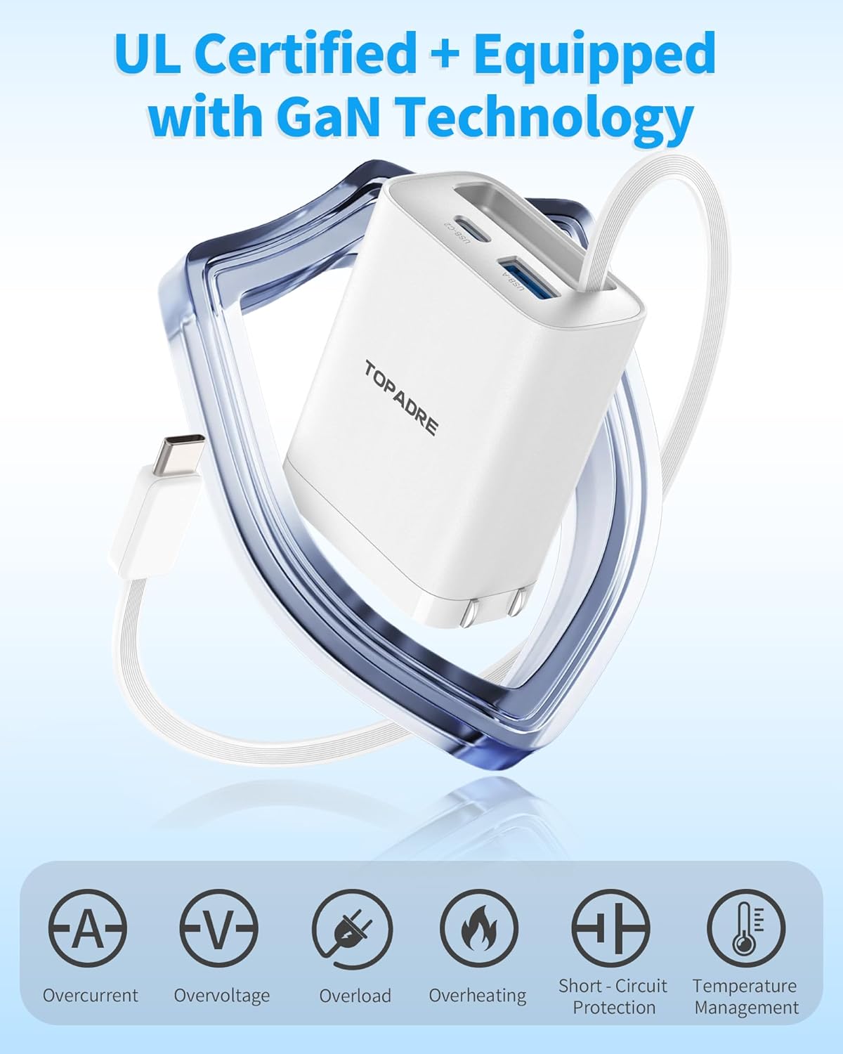 - 【Retractable 65W GaN Charger】: TOPADRE 65W Type-C fast charger is a multifunctional charger with a built-in retractable USB-C cable that can be freely extended from 3cm to a maximum of 85cm, which is most suitable for wiring arrangement around the desktop and storage during travel. Folding plug design, even business bags and suitcases can be compactly stored in pockets.