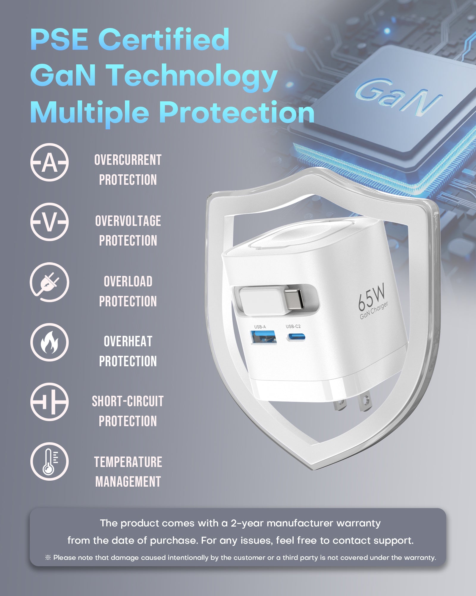 [New GaN Charger]This Retractable USB C charger plug uses advanced gallium nitride (GaN) technology to enable fast charging of i Phone, achieve high output and compact design and intelligently match sa fe current. Compared with traditional charger products, it also has built-in protection against overcharge, overcurrent, overheating and short circuit, providing comprehensive protection for sa fe and worry-free charging.