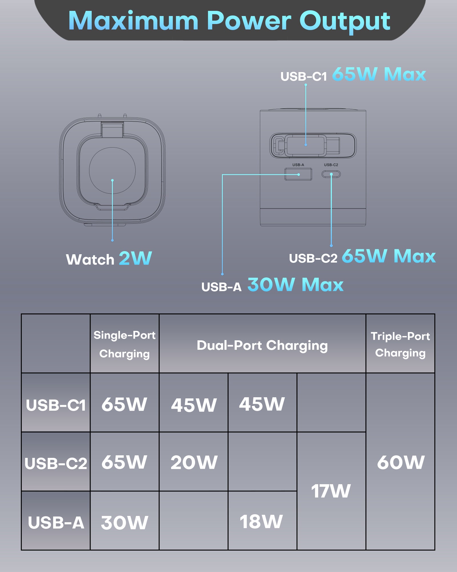 4-in-1 Multi-Device Charging This charger plug is equipped with (USB-C cable, USB-C and USB-A) to charge your laptop (such as Mac-Book), smartphone (i Phone 16/15), applewatch and air pods at the same time without 4 separate plugs and cables. Whether you are in the office, at home or on the go, it can simplify your workspace or travel gear, save space and avoid clutter.