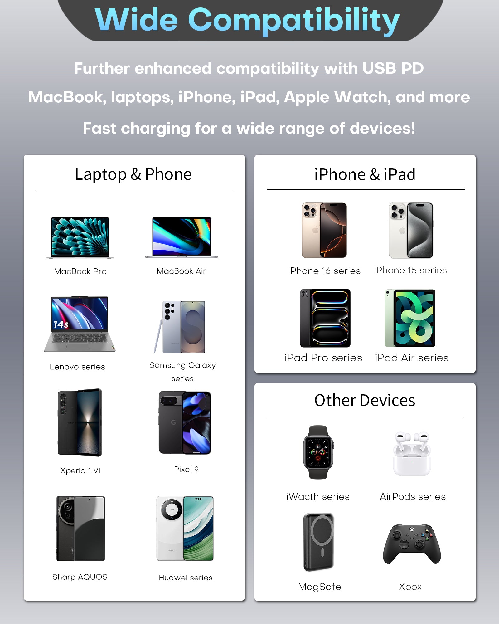 [Wide Compatibility]The USB C plug design is suitable for a wide range of devices, including for applewatch 10/9/8 series, for i Phone 16/15/14/13/12 Pro/Pro Max series, i Pad Pro/Mini/Air, Mac-Book (M1/M2/M3 models), and Galaxy devices, providing versatile charging for all your devices.